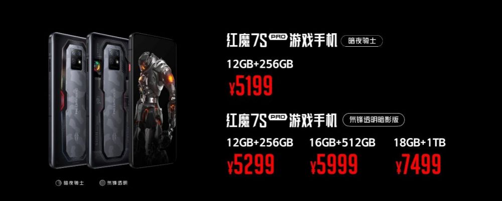 本次红魔7S系列提供了多个存储配置版本,玩家可根据自身需求灵活选择:红魔7S暗夜骑士8+128GB,售价3999元!12+256GB,售价4799元!红魔7S氘锋透明12+128GB,售价4899元!16+256GB,售价5499元!红魔7S Pro暗夜骑士12+256GB,售价5199元!红魔7S Pro氘锋透明暗影版12+256GB,售价5299元!16+512GB,售价5999元!18GB+1TB,售价7499元!挑战行业首款未来科幻风格银色透明设计的红魔7S Pro氘锋透明银翼版,12+256GB售价5299元!16+512GB,售价5999元!掀起红魔“蜂”潮的变形金刚大黄蜂限量典藏套装,售价6499元,将于7月底开售!红魔7S系列已于7月11日16:30在红魔商城、努比亚京东自营旗舰店开启预售,并将于7月15日10:00在全国线上线下渠道同步开售!