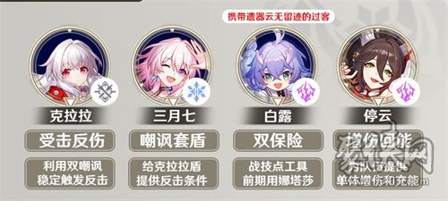 整个队伍以克拉拉与三月七为核心。克拉拉由于自身拥有独特的受击反伤机制,配合三月七的嘲讽+反击,能获得意想不到的效果。由于克拉拉本身为大招依赖的角色,因此配合停元效果极佳,奶位携带云无四件套,为队伍增加战技点,此处白露一般情况最佳,因为群奶能更好的应对怪物的AoE伤害,避免其他角色暴毙,增加阵容稳定性。