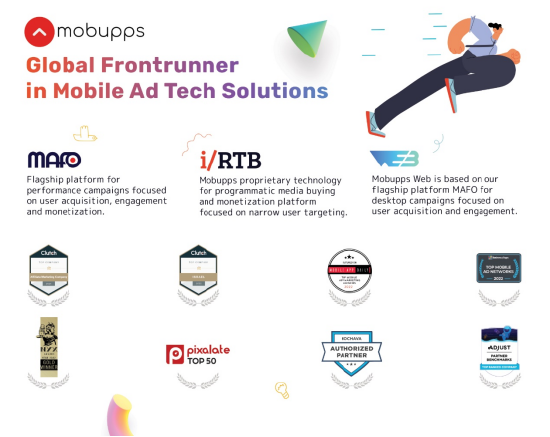 Mobupps 是一家总部位于以色列的一站式广告营销平台,其主要业务为用户获取和流量变现。除总部以色列外,Mobupps 公司在俄罗斯、中国、印度、加拿大等国家和地区设有办公室或分支机构。作为移动广告平台,Mobupps 公司拥有着强大的营销能力、技术能力以及数据处理能力,服务于来自全球各地四百多家广告主及渠道商,能够为营销者带来日均十万以上的新增用户量,被全球最具影响力的第三方数据监测公司Appsflyer、Adjust、Branch等评为官方授权合作伙伴。