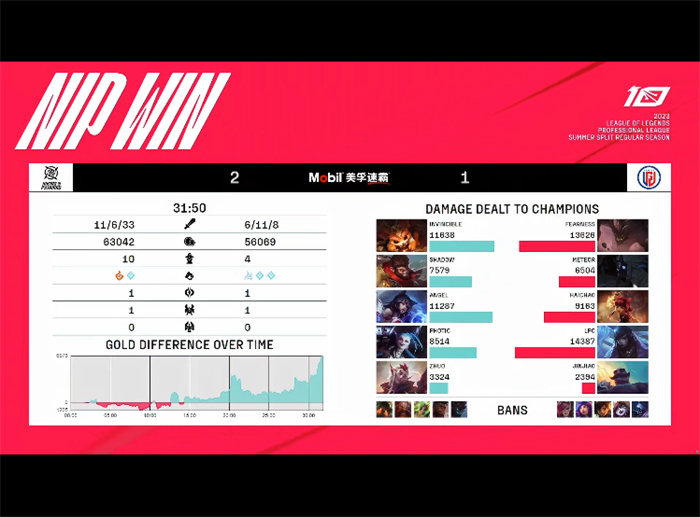 24:15 NIP直接开启大龙,LGD野辅探视野被瞬间秒杀,泽丽滑墙一人被纳尔一掌留下,月男收获三杀,NIP拿到大龙后直接一波推进结束比赛