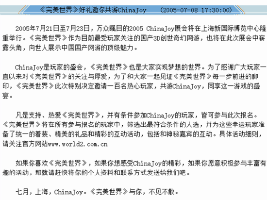 “非常精品,非常完美”在 2010 ChinaJoy 上续写着完美理念。现场近 2 米高的精致游戏模型吸引了众多玩家的目光。到了 2011 年,完美在延续精彩的同时提出了“新完美,新世界”,完美工作人员现场身穿“完美是一种态度”的T恤,展现出追求精品,力创完美的企业理念。