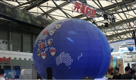 2009 年,完美展台是一片蔚蓝色。硕大的蓝色地球模型给夏日带来一丝清凉的同时,也直观地展示了完美世界游戏全球化的脚步。作为中国游戏海外出口的佼佼者,完美以游戏为载体,将中国传统文化传播到世界各地。
