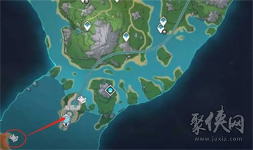 3、沙漠地区的右上角有一个浪船锚点,驾驶帆船过去开启枫丹的第一个七天神像。