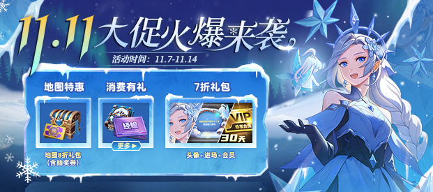 2023年11月7日-2023年11月14日,双十一大促期间,开放地图抽奖券礼包、U币商品八折优惠,更有全新动态头像与进场特效七折出售!不仅如此,玩家可以通过购买商品、累计购买与累计消费领取丰富奖励,包括称号、战令等级、经验书、地图经验加速卡和动态底纹等等~