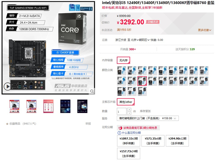 且天猫商城还有华硕B760重炮手WIFI主板搭i5-13490F处理器套包,11.11促销价3292元,可享8.5折优惠及3期免息福利。购买链接:https://detail.tmall.com/item_o.htm?de_count=1&id=666562847538&skuId=5306327235945