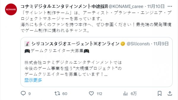 最近科乐美旗下团队Team Silent开始为《寂静岭》特许经营项目招聘新成员,最近科乐美将这则招聘其实挂在了社交媒体账号和官网上。