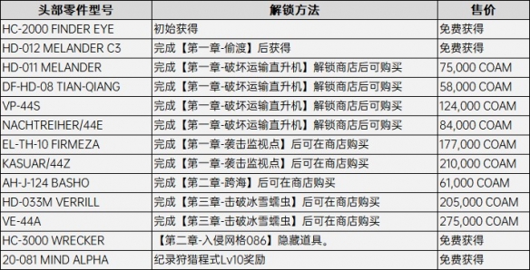 解锁条件:完成[第一章:袭击监视点]后可在商店购买,售价210,000 COAM