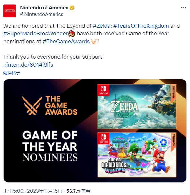 2023年是游戏大年,今年的TGA年度游戏角逐也十分激烈,共提名了六款游戏,而任天堂一家就占了两个:《塞尔达传说:王国之泪》和《超级马里奥兄弟:惊奇》。任天堂现已在其社交媒体上对此做出了回应,提到十分荣幸能够获得两个TGA年度游戏提名,并感谢玩家们今年的支持。