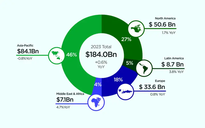 与此同时,该数据公司预测,亚太地区仍将引领全球市场,尽管同比下降 0.8%,但预计其收入将占全球的 46%,达到 841 亿美元。此前预计该地区的收入将增长 1.2%,达到 855 亿美元。
