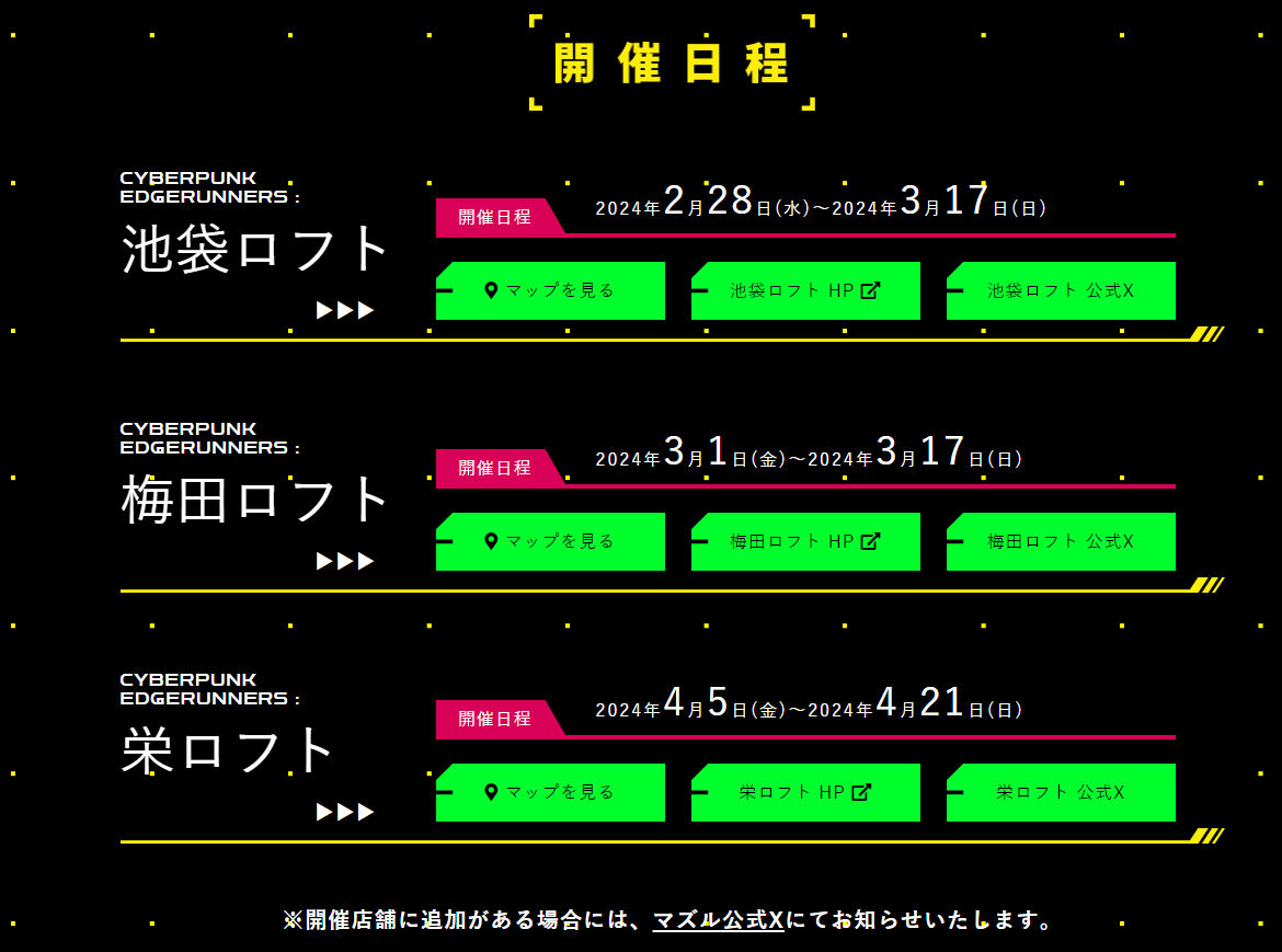 近日Muzzle株式会社宣布,将在日本的东京池袋、大阪梅田和名古屋荣三个地区,开启限时的《赛博朋克:边缘行者》“夜间泳池”主题快闪店。