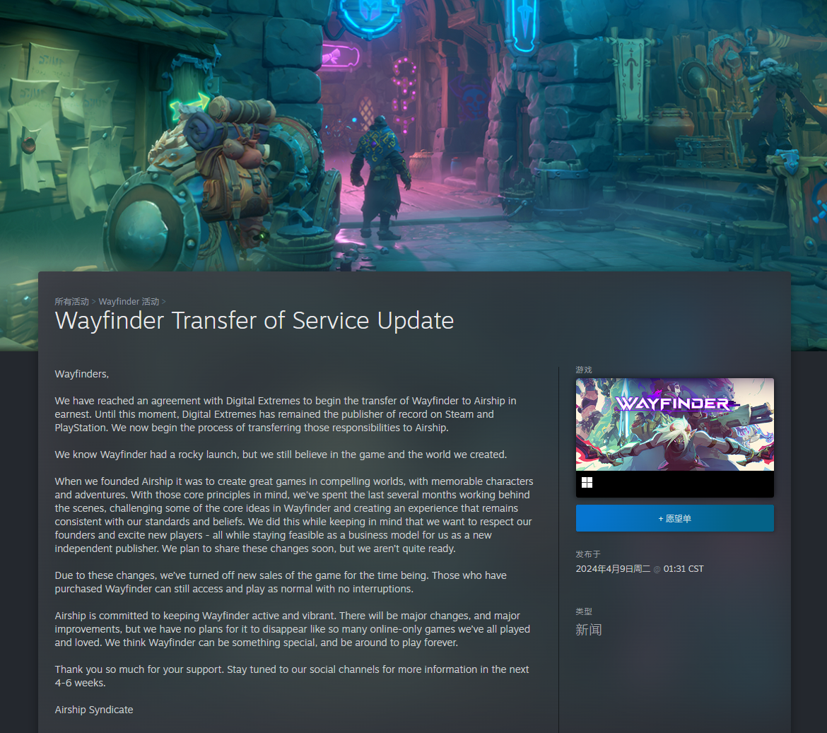 近日Airship将《寻路者》从Steam平台暂时下架,正式开始把发行权转移到Airship内部。在相关声明中Airship表示,虽然《寻路者》的推出并不顺利,但他们“仍然相信这款游戏和我们所创造的世界”。