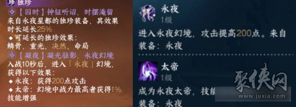 (1)搭配其他永夜独珍效果延长25%。相当于提升鳞骨护腕75点破防;提升三连星手约1点气海/力量+84点元素攻;提升柳星闻手镯约4点五维。有这件衣服的可以尝试余若梦腰带+三连星手+鳞骨护腕的搭配,对部分玩家打桩来说会有提升。