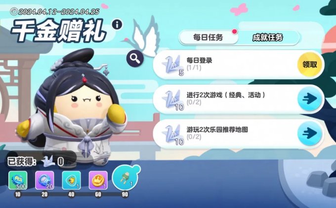 纸鹤乘着四月的春风如约而至,来自千金少女的见面礼也准备就绪。4月12日至25日,【千金赠礼】活动开启,蛋仔们通过完成任务可收集“纸鹤”,累积到指定数量即可免费解锁精美配饰“刺绣香囊”、动作“贵妃醉舞”等奖励!