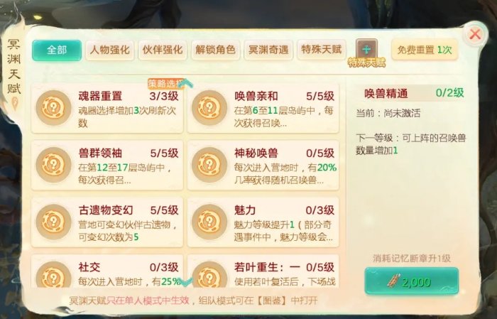 天赋:伙伴古遗物1点,魂器重置、唤兽亲和、兽群领袖、古遗物变幻、人物速度强化、伙伴速度强化、伙伴控制强化全部点满,角色解锁飞剑侠,魂器:首发血书,然后根雕+飞蛾+面具+锁链,关卡选择:魂器岛>奇遇岛>精英岛,召唤兽:2-3个珍珑就够,没合出来就保存退出进来从合,或者去恢复岛变。
