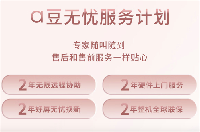 现在入手a豆14 Air还可以享受a豆无忧服务计划,包括2年硬件上门服务、2年内不限次数远程协助、2年整机国际联保以及2年好屏无忧换新四项保障,日常遇上网络问题、电脑死机蓝屏等等,随时联系专家上门或远程处理。