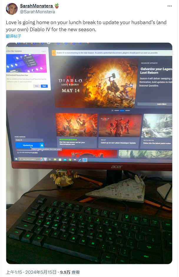 而有一位玩家获得了独一份的特殊“更新内容”,因为他的妻子在工作午休的间隙,回到家中帮他打开了电脑,然后贴心的为他预载新赛季的内容。