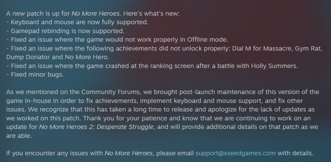 《英雄不再(No More Heroes)》曾于2021年的6月登陆PC平台,不过上线后游戏却不支持键盘鼠标,仅手柄才能游玩,这在当时引起大量玩家的不满。近日,官方宣布在游戏中推出新补丁,以实现对键盘和鼠标的支持,并对缺乏沟通和漫长的更新过程向粉丝道歉。