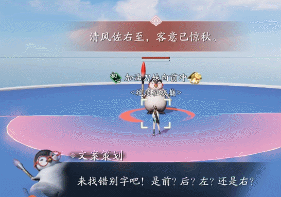 考验少侠反应力的时刻到了!文案策划将发起错字找茬挑战,少侠需找到策划提出的诗句当中的错别字,该错字即为接下来的技能释放方向,届时前往相反的区域躲避即可。贴心的文案策划也将在技能释放前提示正确答案,集中精神,注意躲避!