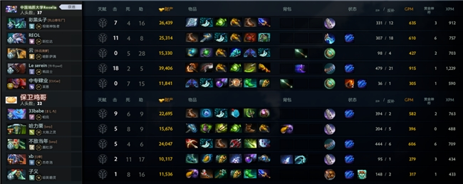 首局比赛中,本次赛事仅存的女选手,武汉大学的哈力栗发挥出色,操刀半人马战行者早早掏出跳刀,以攻代刷,帮助双大哥迅速做出装备并带上不朽盾。中国地质大学(武汉)发育不良的幻影刺客完全不是殁境神蚀者和熊战士的对手,孽主和昆卡也不是什么可以被寄予厚望的英雄,在被刷新球殁境神蚀者几次劈头盖脸之后,中国地质大学(武汉)打出GG。