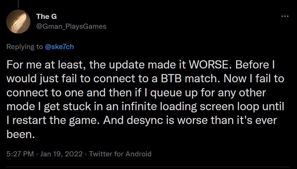 推特和 Reddit 论坛上的一些玩家纷纷确认修复失败。事实上,一些玩家报告称安装更新后遇到了新的问题,包括网络突然延迟掉包以及无法连接到游戏服务器。